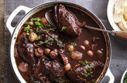 Coq au vin is a fall/winter French dish of chicken braised with wine, lardons, mushrooms, and pearl onions. A red Burgundy wine is typically used. It is a fun cooking class and a delicious meal to share!